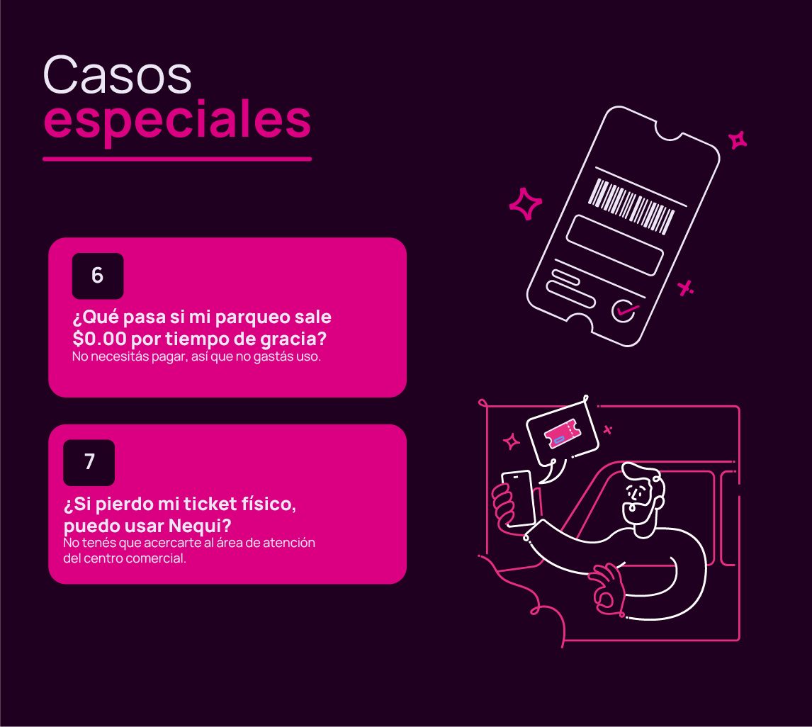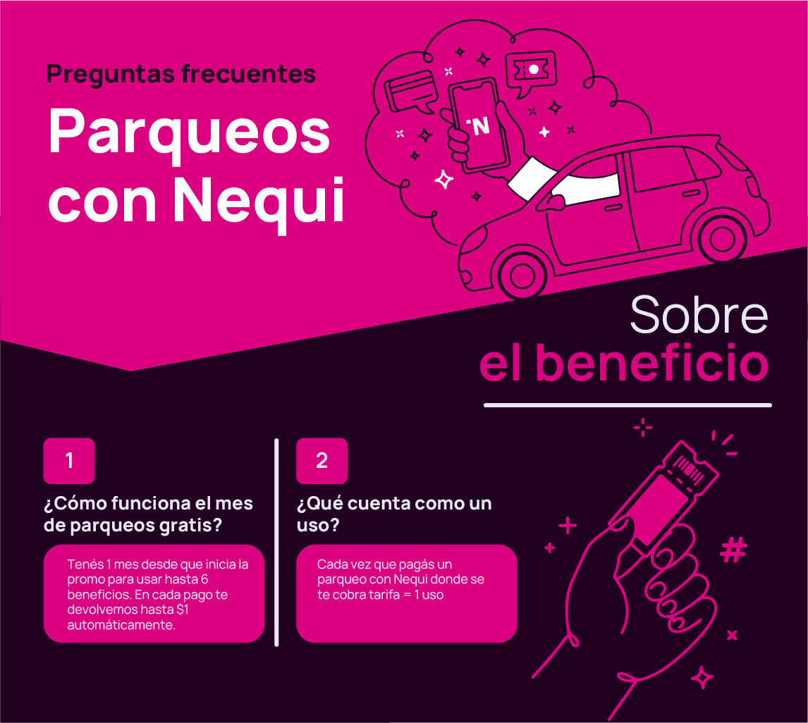 Con tu primer pago de parqueo usando Nequi, se activa un beneficio de 30 días en el que podés recibir hasta $6 en total, distribuidos en un máximo de 6 usos. Cada vez que pagás un parqueo con la app, cuenta como un uso. En cada pago te devolvemos hasta $1: si el parqueo cuesta menos, recibís exactamente lo que pagaste; si cuesta más, Nequi pone $1 y vos deberás pagar el resto. El reembolso se hace automáticamente después de pagar y te cae directo a tu cuenta. Podés usar tus 6 parqueos cuando querás, incluso el mismo día, y en cualquiera de los centros comerciales participantes. No importa si los usás todos en un solo lugar o los combinás.