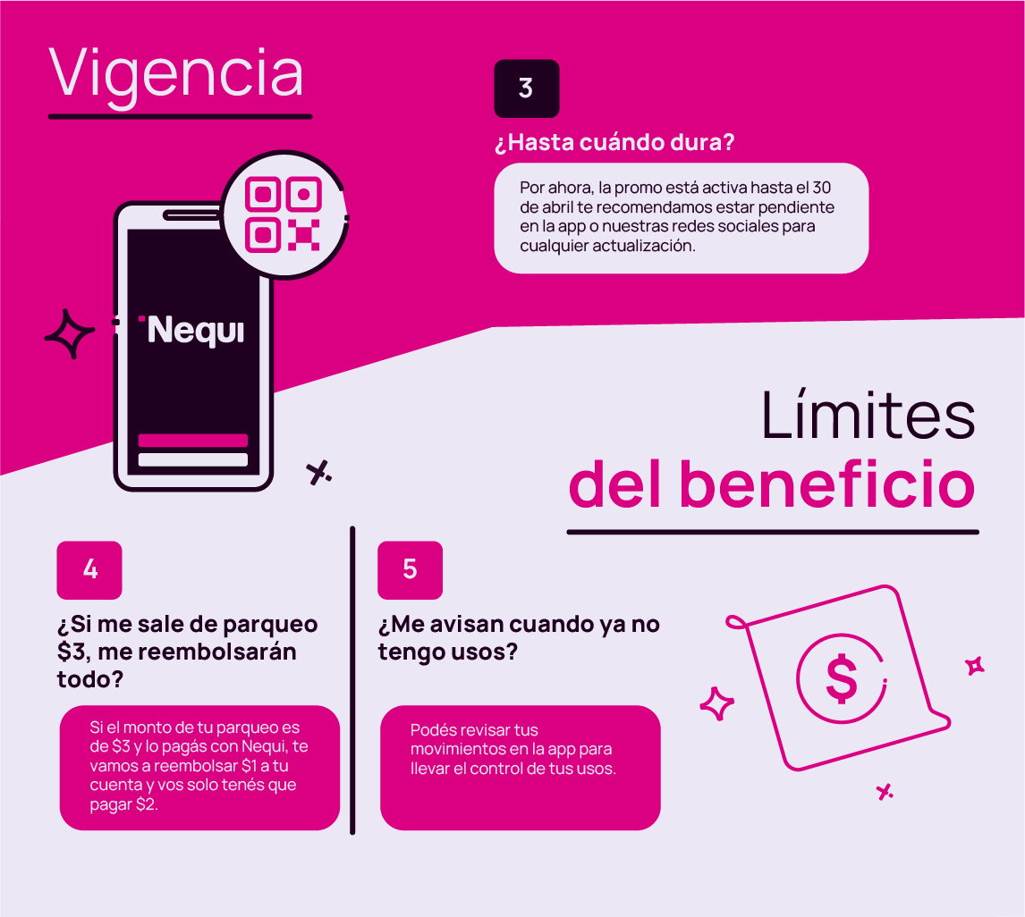 El beneficio solo aplica cuando pagás con QR desde la app de Nequi. No funciona con efectivo, otros métodos de pago como la tarjeta física Nequi. Si no hay cobro de parqueo, no se consume ningún uso. Los usos no se acumulan ni se reinician. Si no se usan dentro de los 30 días, se vence el beneficio. La promo está disponible por tiempo limitado en La Gran Vía y Multiplaza y podrá finalizar en cualquier momento sin previo aviso, sujeto a disponibilidad.