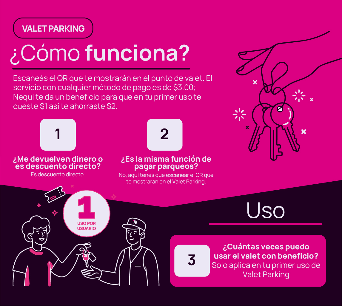 El servicio de valet parking tiene un costo regular de $3.00, pero con Nequi obtenés un beneficio únicamente en tu primer uso, pagando solo $1.00. Es un descuento directo, no un reembolso. Este beneficio funciona de forma independiente al pago de parqueos, por lo que no es la misma dinámica ni consume usos de tu mes de parqueos. El beneficio es válido únicamente una vez por usuario.